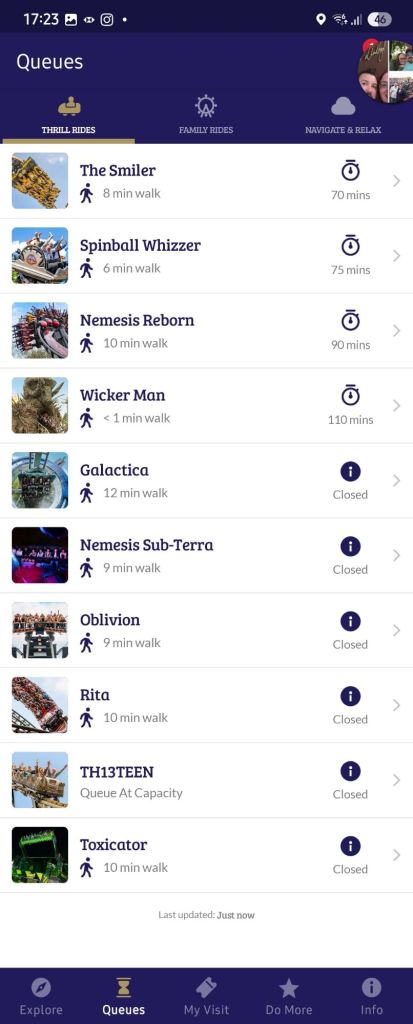 Each time I looked in the app, Oblivion and Th13teen were closed. Rita then followed, and Spinball Whizzer seemed to spend more time out of service than in. Wicker Man suffered yet another fire alarm activation and Galactica and Nemesis also spent a lot of time out of action throughout the day.